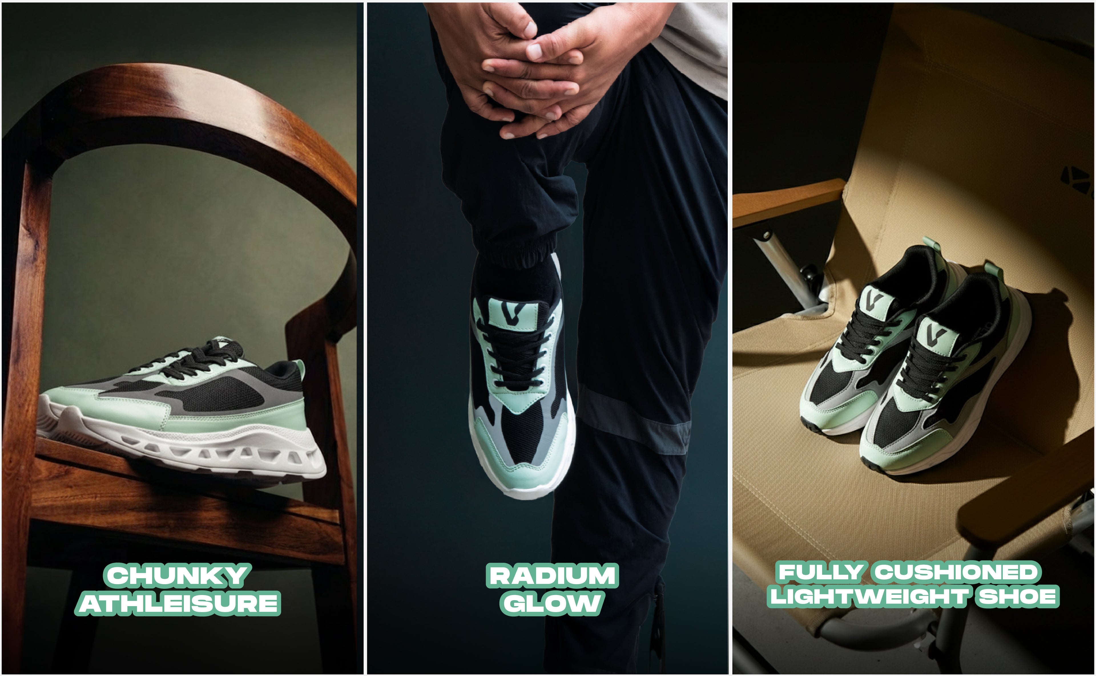 Volton Sage Illusion sneakers feature a modern chunky sole with reflective grey patches for a bold streetwear look. Super lightweight yet durable, they combine cushioned comfort with a stylish sage green finish. Designed for versatility, these sneakers are perfect for casual outings, semi-formal fits, and fashion-forward everyday wear.